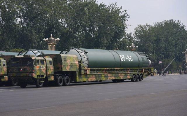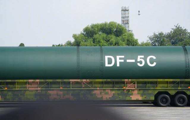 “打击范围覆盖全球”,东风-5C帅照再看亿遍。东风-5C有多大?网友:三辆军车才能拉得下。