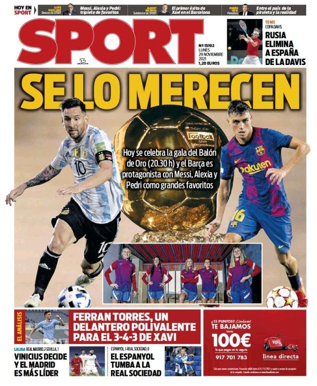 该报对金球奖的报道非常丰富,从封面到P7都是,有关于梅西、普特利亚斯和佩德里分别是男女足金球、最佳新人科帕奖的最大热门,也有梅西为图片主角的2个整版介绍金球评选和当晚盛会。